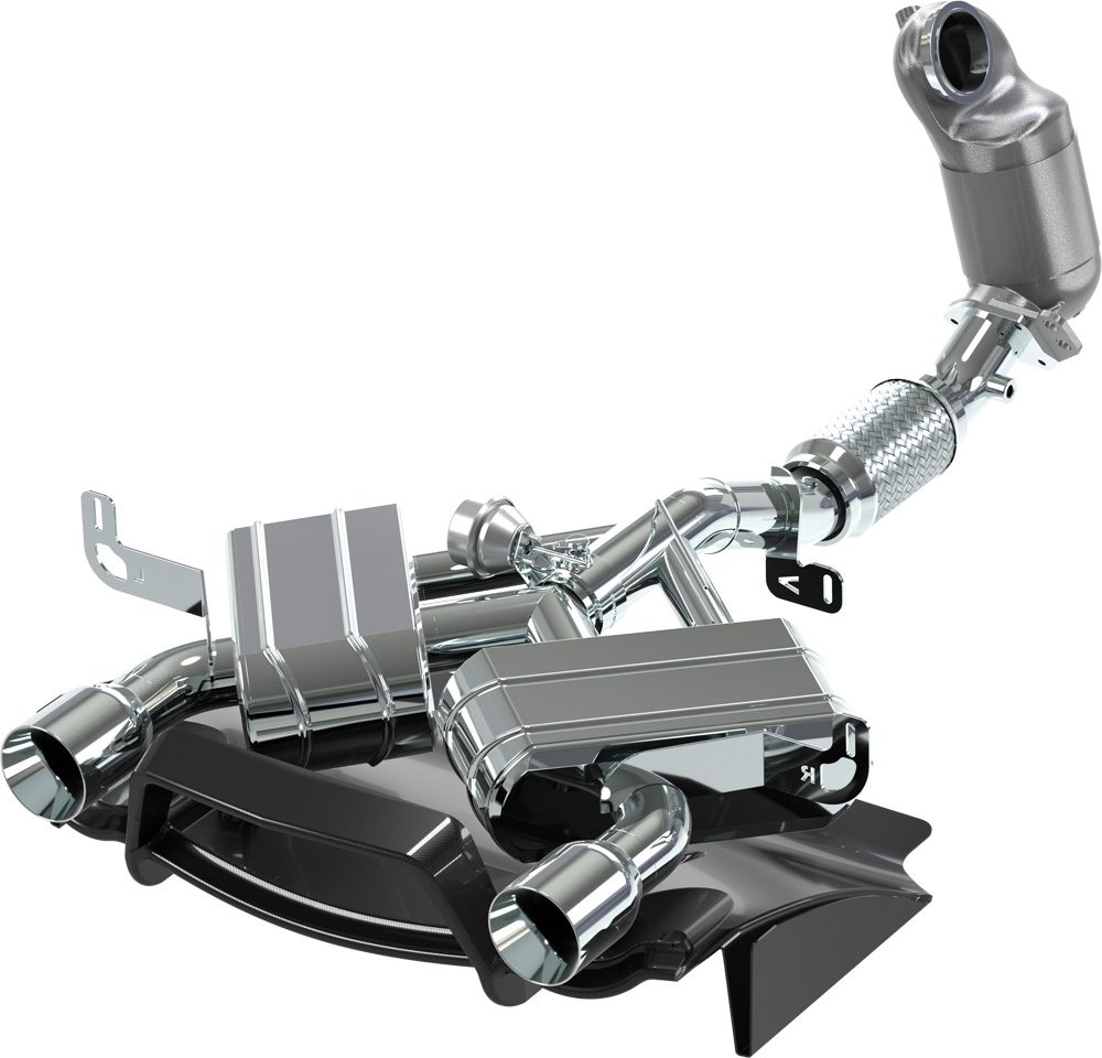 Die Abgasanlage besteht aus hochwertigem Edelstahl, Vollcarbon-Blendenrahmen sowie einem Vollcarbon-Heckdiffusor.