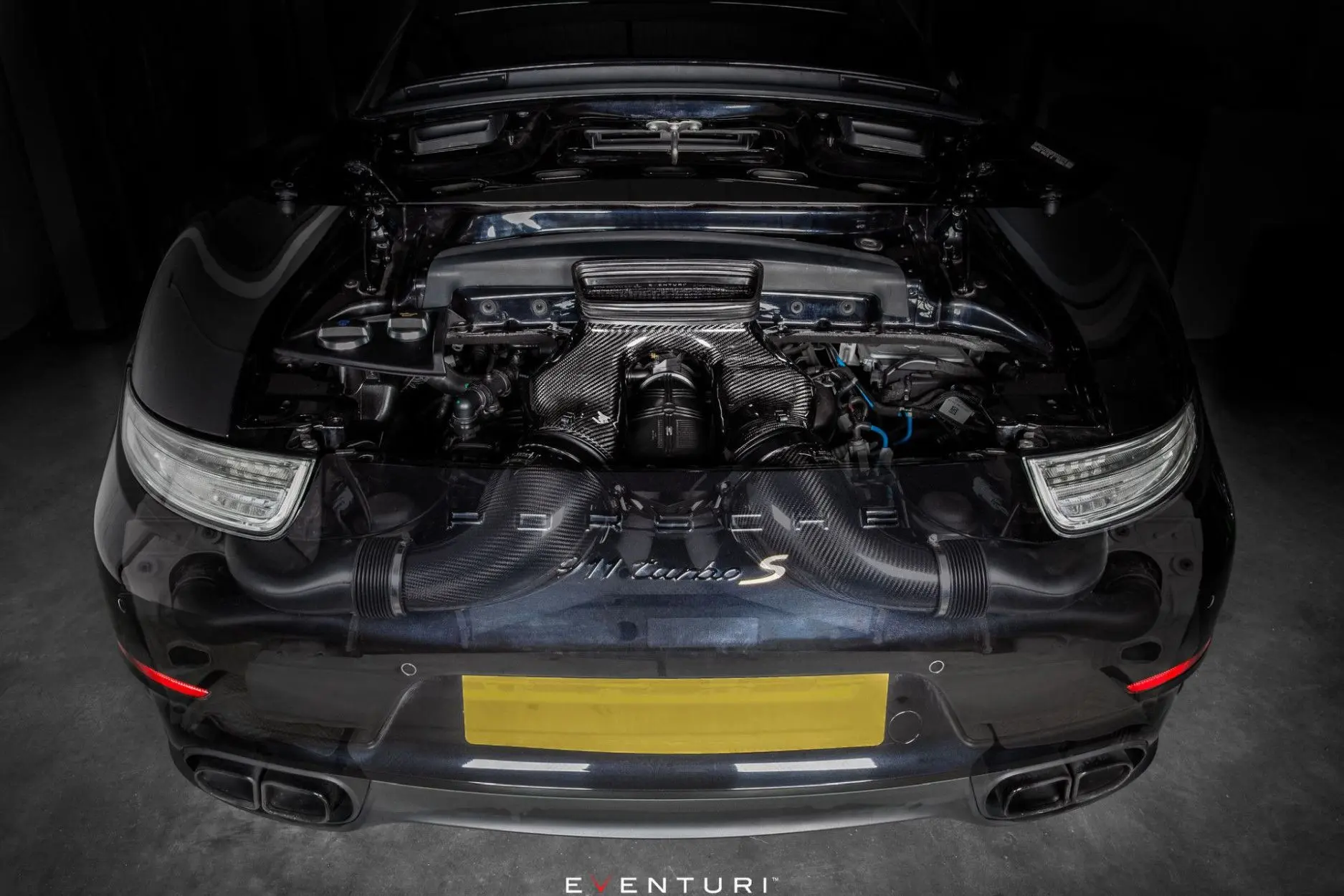Das Einlasssystem des 991 Turbo Eventuri wurde durch umfangreiche Tests unter realen Bedingungen mit dem Ziel entwickelt, die Turbos effizienter arbeiten zu lassen. Durch das Ersetzen der einzelnen Standard-Airbox durch einzelne patentierte Venturi-Filtergehäuse können die Turbos mit weniger Luftwiderstand spulen und Auftrieb erzeugen. Infolgedessen werden die Wastegate-Arbeitszyklen reduziert, was zu einer Spitzenverstärkung bei niedrigeren Drehzahlen führt und daher die Leistung erhöht. Die zwei einzelnen Filter bieten eine größere Filterfläche im Vergleich zu dem einzelnen Plattenfilter. Um die Einlasslufttemperaturen niedrig zu halten, sind die Venturi-Gehäuse außerdem gegen einen Luftkanal abgedichtet, der Umgebungsluft von derselben Stelle wie das Lagersystem ansaugt. Da der Motorraum des 911 Turbo dicht gepackt ist, können hohe IATs nur durch ein vollständig abgedichtetes Ansaugsystem vermieden werden.