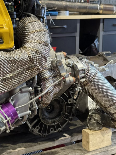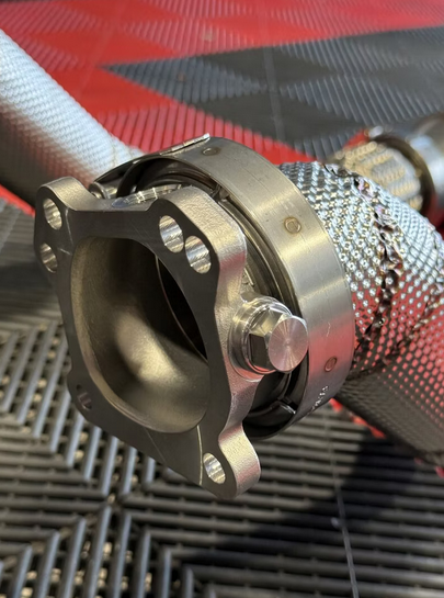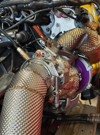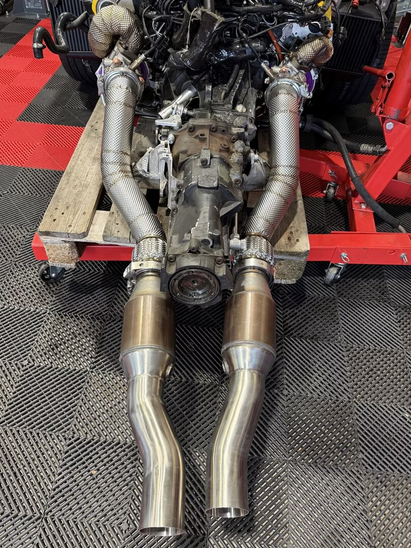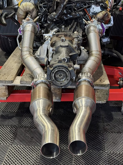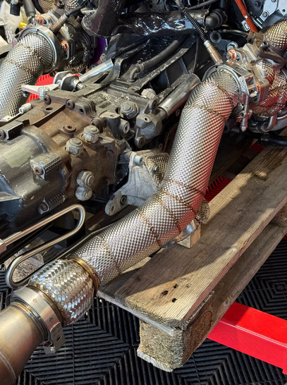 Die Downpipes bestehen vollständig aus Edelstahl und sind für höchste thermische Belastungen ausgelegt. Je nach Konfiguration kann zwischen einer durchgehenden Rohrführung oder verschiedenen V-Band-Systemen gewählt werden. Optional ist eine Thermoisolierung erhältlich, um die Wärmeabstrahlung im Motorraum zu reduzieren.
