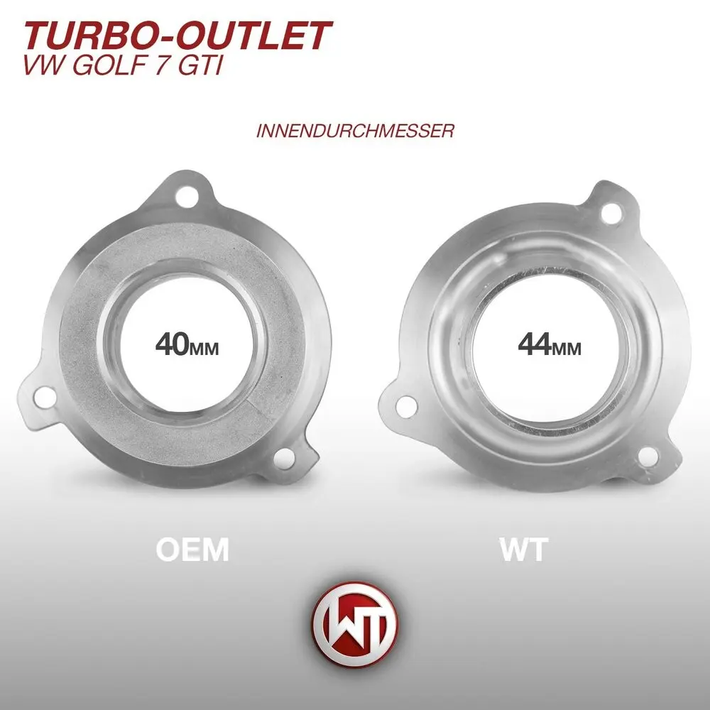 Die Bauform des WagnerTuning Turbooutlets wurde mit Hilfe von CFD Strömungssimulationen für einen bestmöglichen Luftmassendurchsatz ausgelegt. Der Innendurchmesser wurde von Ø40mm auf Ø44mm vergrößert. Dies entspricht einer Querschnittsvergrößerung von knapp 22%. Daraus resultieren eine höhere Maximalleistung und ein verbessertes Ansprechverhalten.