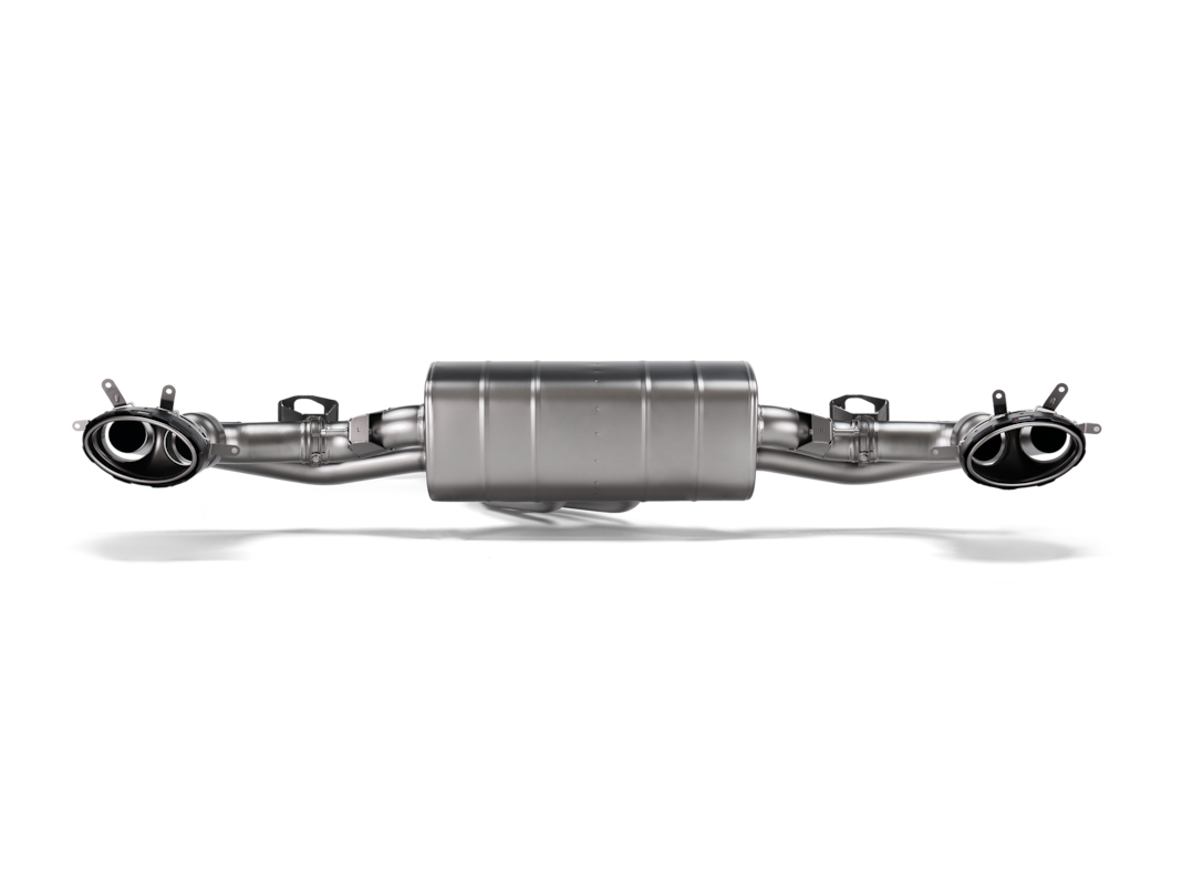 Herzstück der Evolution Line ist der zentrale Titan-Schalldämpfer mit zwei integrierten Abgasklappen, deren Gehäuse in der Akrapovič-eigenen Gießerei gefertigt werden. Ergänzt wird das System durch ein speziell entwickeltes Link Pipe Set mit X-Connection-Element, das für eine optimal definierte Durchmischung der Abgase sorgt. Diese Konstruktion erzeugt im oberen Drehzahlbereich einen markanten, hochfrequenten Akrapovič Rennsound, während im unteren Drehzahlbereich ein tiefes, kraftvolles V8-Grollen dominiert – unverkennbar und emotional.