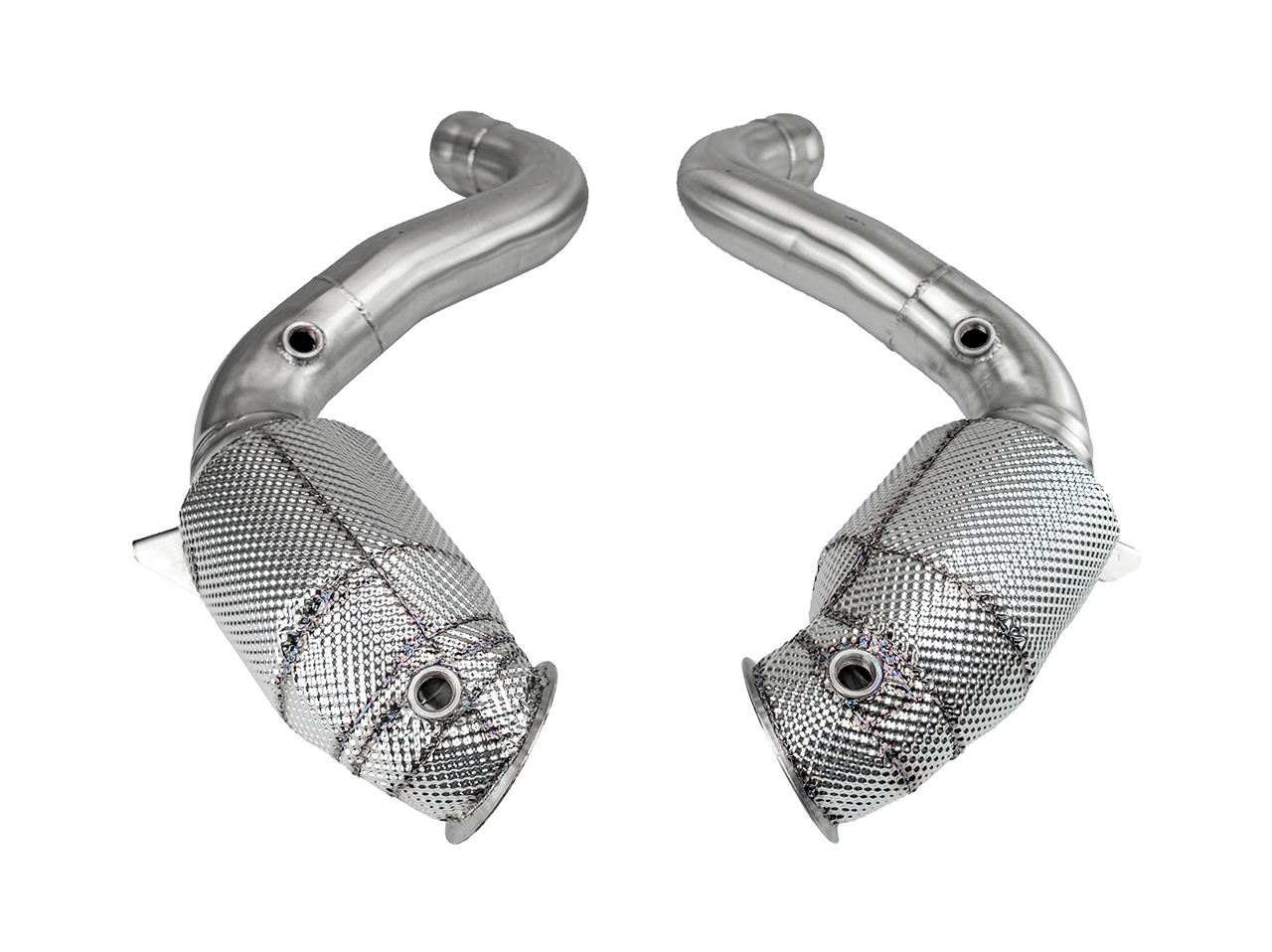 Wie die 2-teilige Bull-X Edelstahldownpipe inkl. 200 Zellen Sportkat für den Mercedes Benz C63.