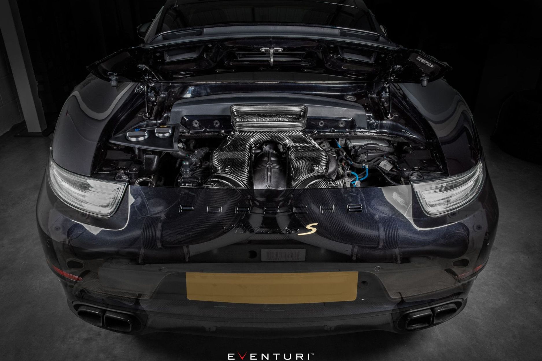 Das Einlasssystem des 991 Turbo Eventuri wurde durch umfangreiche Tests unter realen Bedingungen mit dem Ziel entwickelt, die Turbos effizienter arbeiten zu lassen. Durch das Ersetzen der einzelnen Standard-Airbox durch einzelne patentierte Venturi-Filtergehäuse können die Turbos mit weniger Luftwiderstand spulen und Auftrieb erzeugen. Infolgedessen werden die Wastegate-Arbeitszyklen reduziert, was zu einer Spitzenverstärkung bei niedrigeren Drehzahlen führt und daher die Leistung erhöht. Die zwei einzelnen Filter bieten eine größere Filterfläche im Vergleich zu dem einzelnen Plattenfilter. Um die Einlasslufttemperaturen niedrig zu halten, sind die Venturi-Gehäuse außerdem gegen einen Luftkanal abgedichtet, der Umgebungsluft von derselben Stelle wie das Lagersystem ansaugt. Da der Motorraum des 911 Turbo dicht gepackt ist, können hohe IATs nur durch ein vollständig abgedichtetes Ansaugsystem vermieden werden.